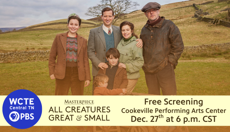 WCTE PBS invites you to a free screening of the new season of "All Creatures Great & Small" on Dec. 27th at 6 p.m. Join us for an exclusive sneak preview at the Cookeville Performing Arts Center.